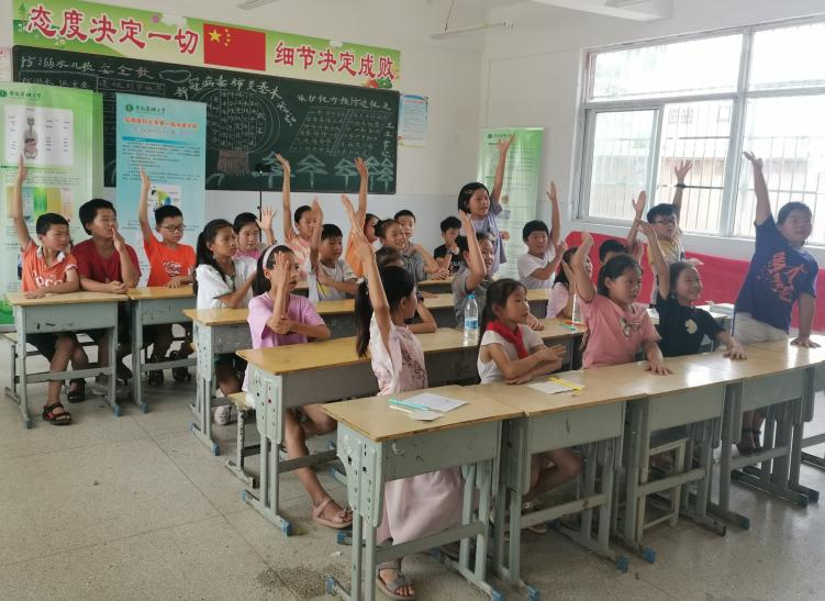 “牛奶水果不可少,不挑食,不偏食,我是健康小宝宝!”队员赵子嫣正带着小学生共唱健康童谣。正是在寓教于乐中队员们带着小学生认识各类食物,教会他们餐前七步洗手法,并教育他们一米一粥当思来之不易,珍惜眼前粮食。“孩子们来上课时脸上尽是天真烂漫的笑容,早早地在教室里坐好等我们。课堂上回答问题时都将黝黑的小手举得高过头顶”,队员卢怡如说道。