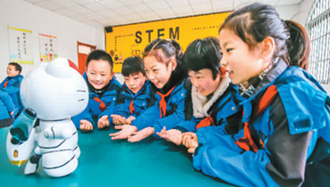 把人工智能装备引入课堂是“智慧教育”的重要形式之一。江苏省宿迁市泗洪县第一实验学校请来机器人“老师”,与学生进行互动交流,在欢乐愉快的氛围中,启发孩子们勤于思考,激发他们的探索热情。(摄于2019年12月19日)人民图片 第二...