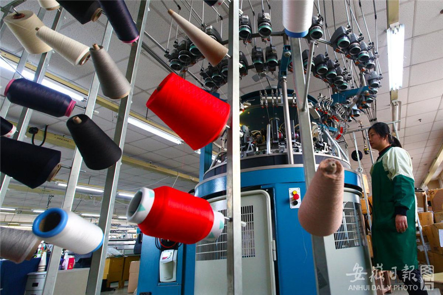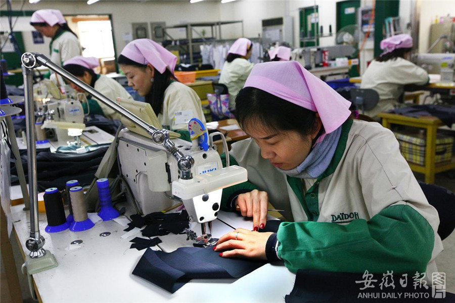 2月25日,马鞍山经开区大同佳乐登(马鞍山)有限公司员工在加工制作出口服装。该公司产品90%出口到日本和欧美等国家和地区。今年以来,马鞍山市进出口保持良好增长态势,1月份,全市出口额达2.1亿美元,同比增长65.2%,实现了开门红。
