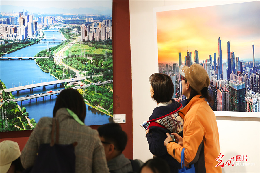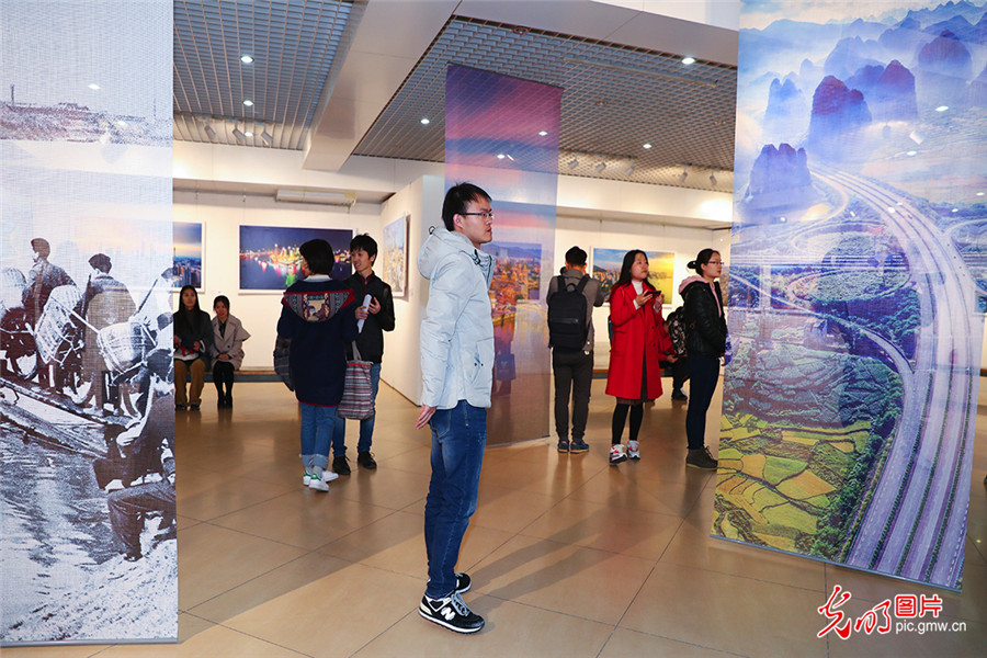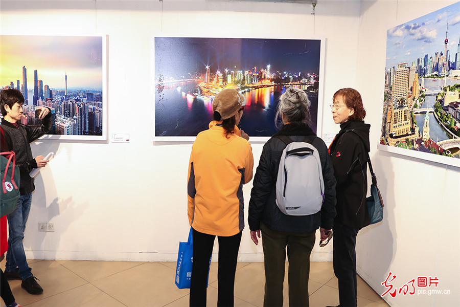 3月12日,喜迎新中国成立70周年——全国主流媒体“航拍中国”摄影图片展在北京航空航天大学艺术馆开幕。展览由中国新闻摄影学会、北京航空航天大学、光明网联合主办,中国新闻摄影学会无人机摄影专业委员会、北京航空航天大学党委宣传部承办。中国新闻摄影学会会长徐祖根,光明网总裁、总编辑杨谷,北京航空航天大学副校长张广,中国新闻摄影学会无人机专业委员会主任王建华等先后在开幕式上致辞。中国新闻摄影学会副会长赵建伟、周朝荣、姚军、丁伟,常务副秘书长陆中秋等,以及社会各界新闻工作者、摄影爱好者、北航师生代表参加开幕式。图为观众在艺术馆内参观展览。(光明网记者 潘迪摄/光明图片)