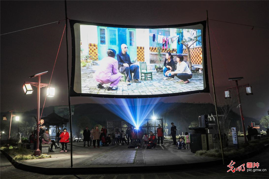在四川省华蓥市有一支由"流动电影院"和"流动图书馆"联合组成的法治宣传队,他们以山区群众喜闻乐见的形式,把欢乐和法治知识送到千家万户。图为,2019年3月12日,宣传队在阳和镇偏岩子新村放映法治宣传片"农村防范诈骗常识"。(邱海鹰摄/光明图片)