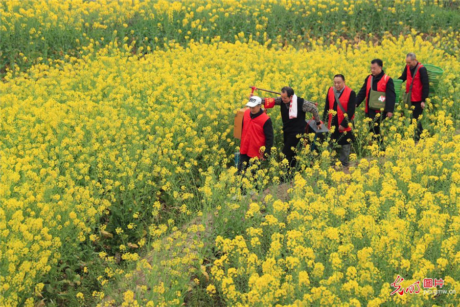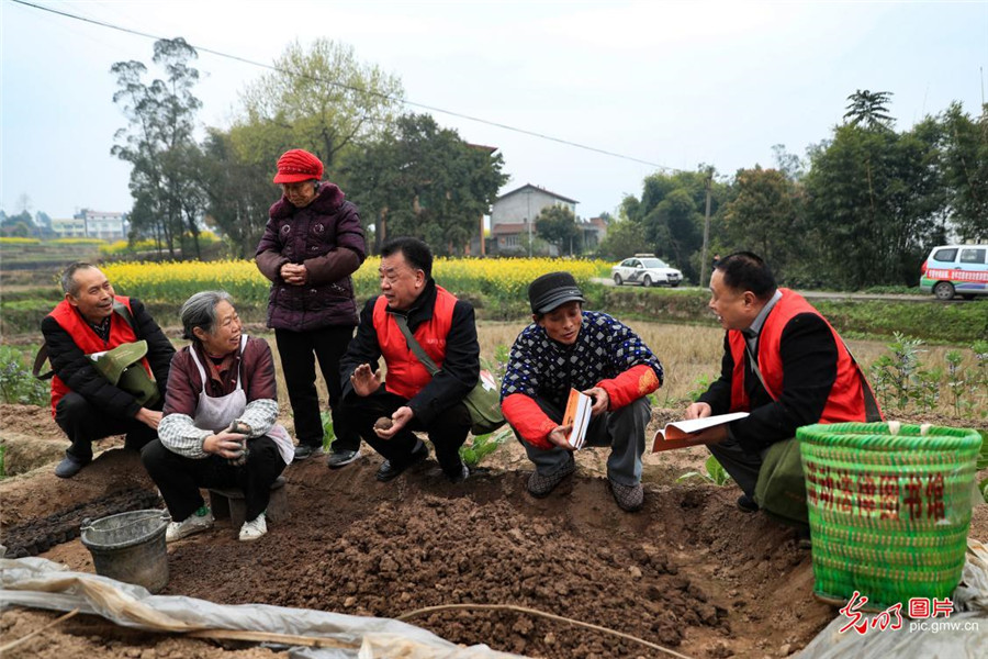 在四川省华蓥市有一支由"流动电影院"和"流动图书馆"联合组成的法治宣传队,他们以山区群众喜闻乐见的形式,把欢乐和法治知识送到千家万户。图为,2019年3月12日,宣传队在东方村的田间地头,给劳作的群众宣讲法治知识。(邱海鹰摄/光明图片)