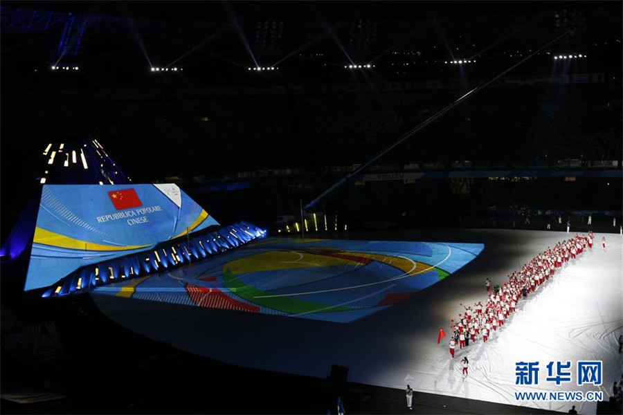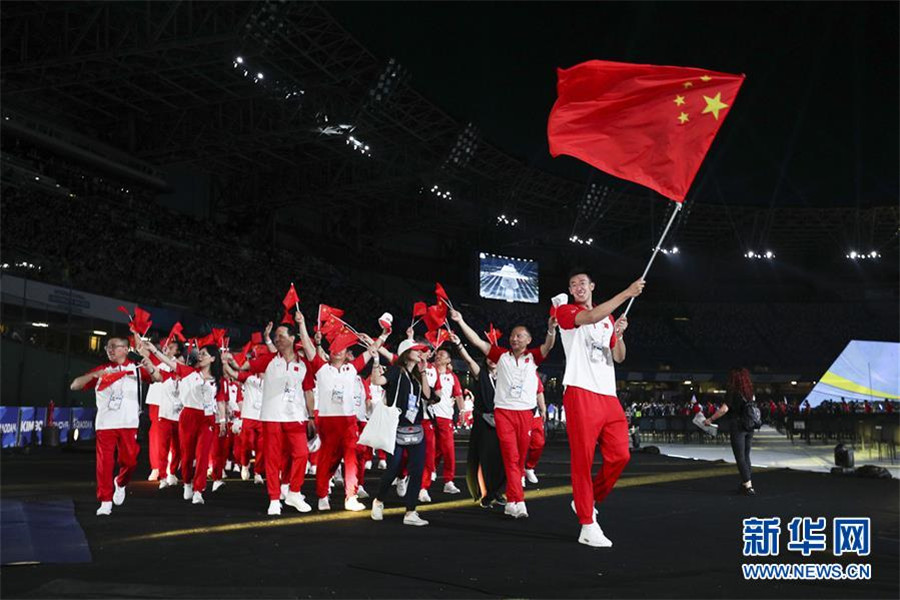 7月3日,中国大学生体育代表团在开幕式上入场。 当日,第30届世界大学生夏季运动会在意大利那不勒斯开幕。 新华社记者郑焕松摄