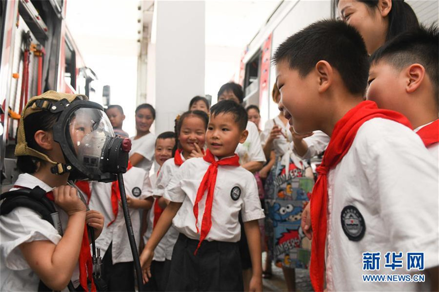 7月17日,小学生在体验消防救援装备。 当日,安徽省合肥市逍遥津小学组织学生及家长走进合肥市消防救援支队特勤大队一中队,通过学习消防知识,提高安全自救意识。 新华社记者 张端 摄