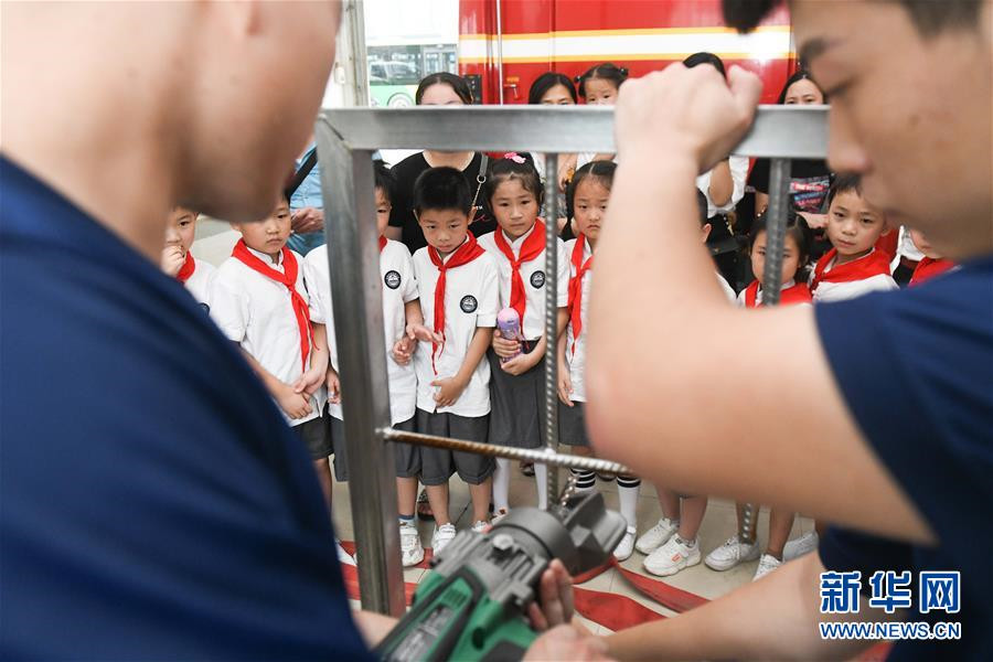 7月17日,消防队员(前)在给小学生演示如何操作消防救援工具。 当日,安徽省合肥市逍遥津小学组织学生及家长走进合肥市消防救援支队特勤大队一中队,通过学习消防知识,提高安全自救意识。 新华社记者 张端 摄