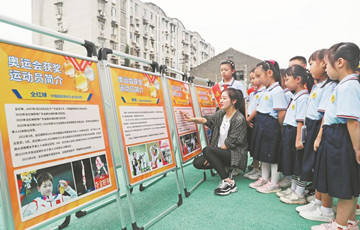 8月29日,合肥市大通路小学教育集团大通校区老师在展板前给一年级新生讲解奥运冠军的成长故事。当日,该校结合“奥运”主题举办一年级新生入学仪式,让孩子们感受冠军们顽强拼搏、努力进取的奥运精神。本次活动中,通过精心设置的一些运动项目,帮助孩子们从小养成良好的运动习惯。