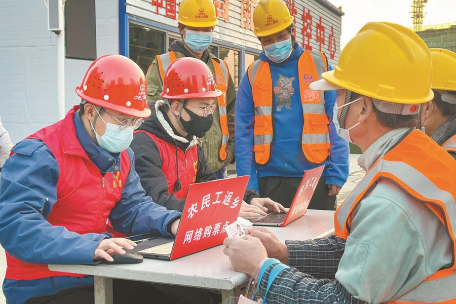 1月7日,中铁上海局三公司创智天地项目部组织青年志愿者在工地设立农民工购票服务点,帮助不会上网的农民工兄弟购买返乡车票,温暖民工回家路。记者 李博 通讯员 龚邵李 摄