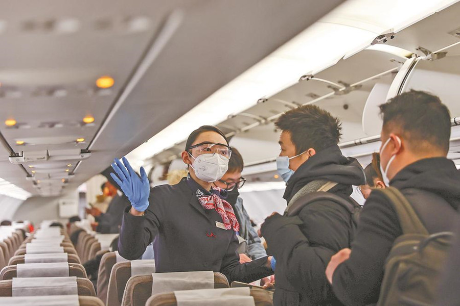 1月7日,合肥新桥国际机场,东航执飞的合肥—西安MU2385航班上,乘务员在服务旅客。据悉,春运期间,合肥新桥机场计划执飞航班约9750架次,旅客吞吐量约95.8万人次。记者 范柏文 摄