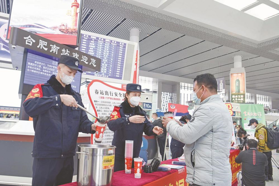 1月7日,2023年春运拉开帷幕。图为合肥铁路公安处民警在合肥南站为旅客送上姜茶。合肥南站春运的首日客流量相比去年同期有明显回升。记者 温沁 摄
