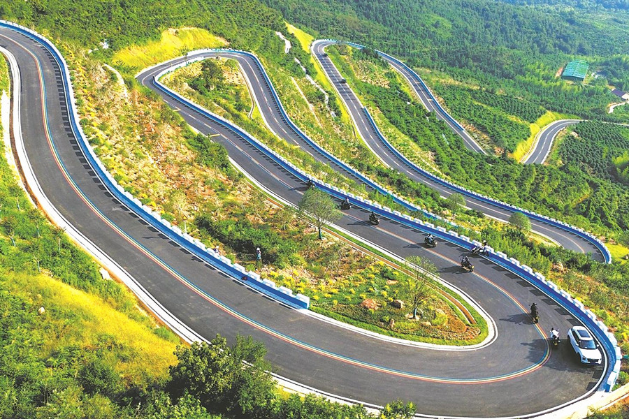 9月9日,庐江县矾山镇双顶山六道拐路段,摩托车队在体验群山弯道骑行的乐趣。近年来,庐江县着力谋划庐东南地区乡村旅游,按照我省旅游风景道标准建设120公里线路, 沿线“九曲十八景”的绮丽风光吸引了众多游客。