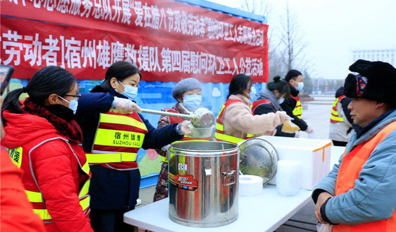 1月18日,宿州市埇桥区新时代文明实践中心志愿服务总队联合雄鹰救援队的志愿者,将热气腾腾的腊八粥送到了正在街头巷尾清扫卫生的环卫工人手中。