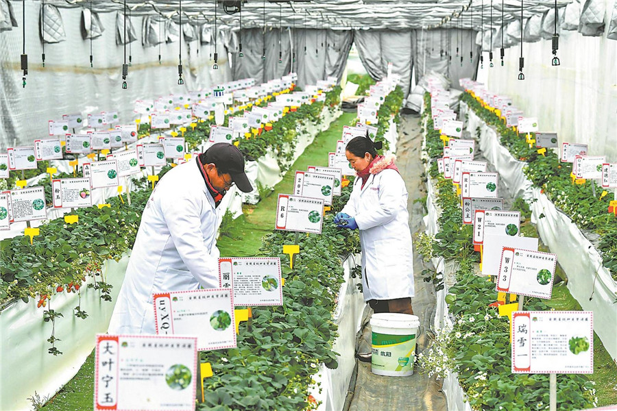 2月20日,安徽省级草莓种质资源圃,长丰县农业技术推广中心工作人员在进行疏花疏果田间作业。通讯员 袁兵 摄