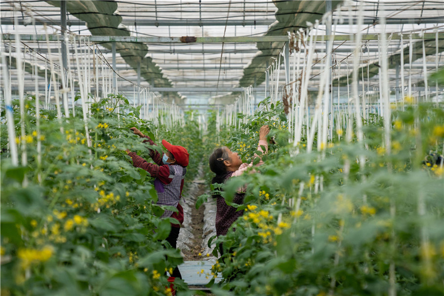 5月5日,正值立夏,合肥市庐阳区大杨镇岗西村,菜农在管护甜瓜、西红柿。通讯员 阮雪枫 摄