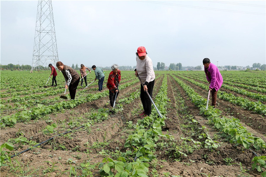 5月5日,蒙城县小辛集乡李大塘村农民正在田间劳作,清除大豆田里的杂草。立夏时节,该县乡村田间地头到处是一派忙碌景象。 通讯员 胡卫国 摄