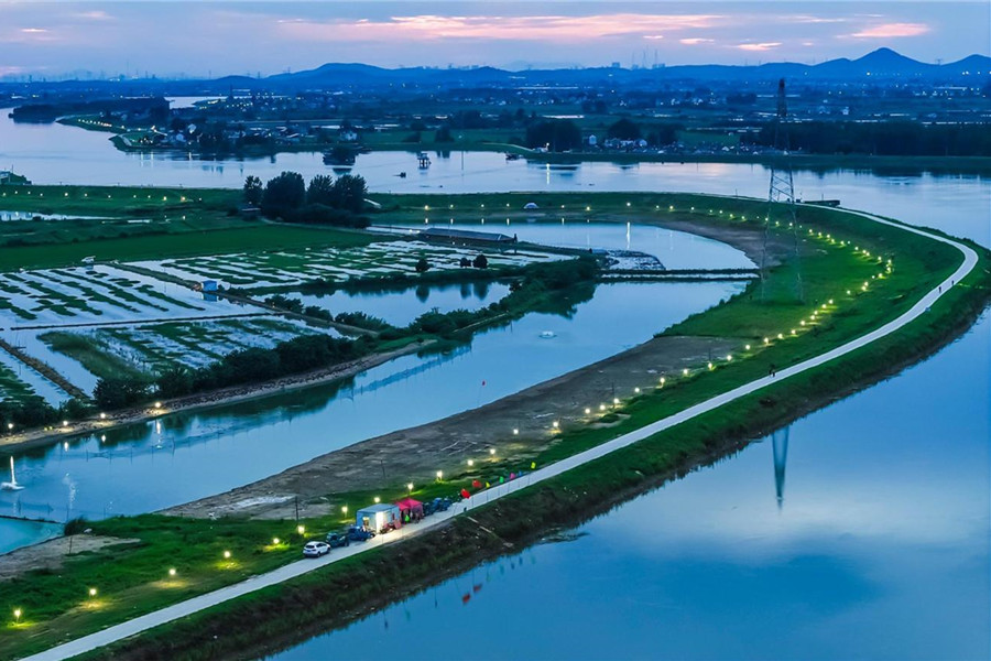 7月17日晚,防汛应急照明灯点缀于马鞍山市博望区新市镇运粮河防汛大堤上,筑起了一道明亮防线。连日来,博望区1000多名党员、志愿者等,守护着35.7公里防汛大堤。