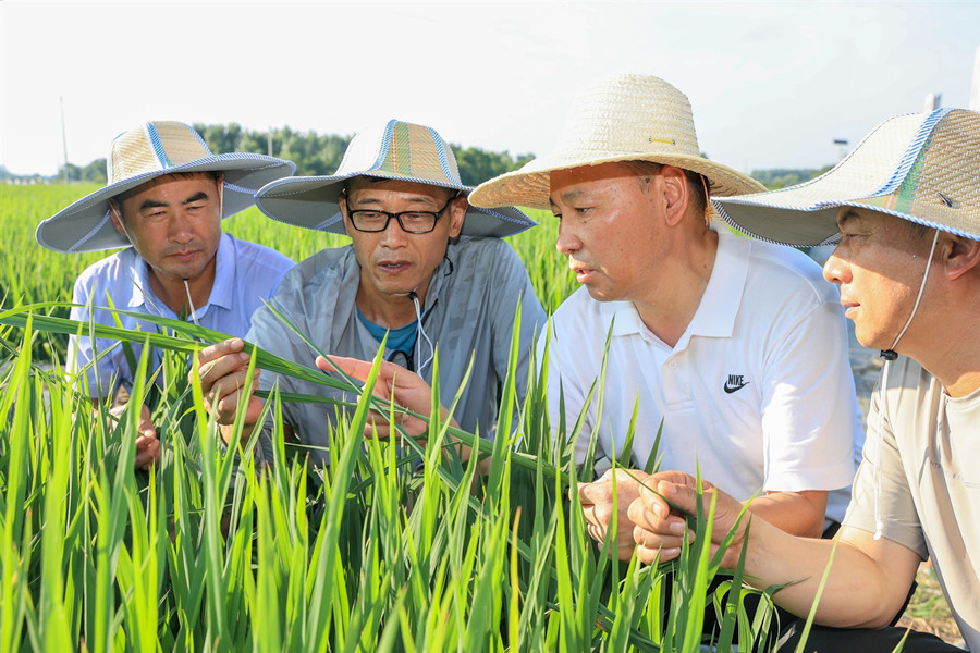 7月21日,安徽农业大学水稻专家吴文革(右二)来到合肥市肥东县石塘镇省级农业科技示范基地,在田间地头“把脉问诊”水稻产量形成关键期的田管,指导种粮大户防范涝旱急转,科学应对高温天气;精准施用穗肥和做好穗期病虫害预防,助力水稻增产丰收。