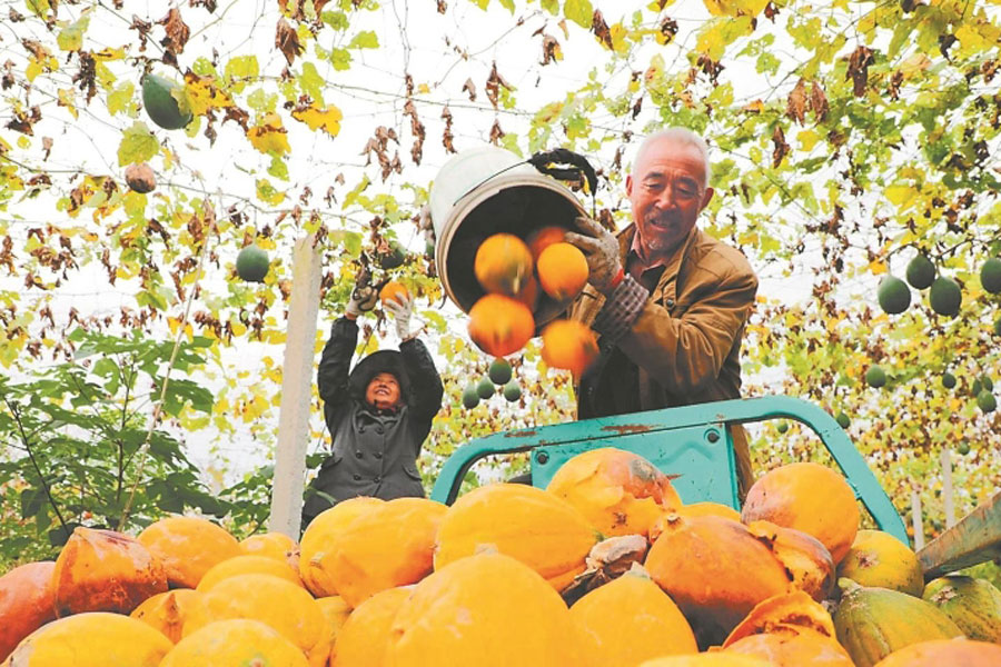 10月19日,阜阳市颍东区口孜镇焦庄村瓜蒌种植基地,村民在采收成熟的瓜蒌。近年来,该区大力发展瓜蒌种植产业,延伸拓展产业链,促进农业增效、农民增收。