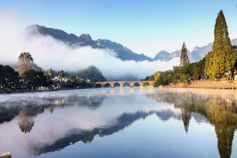 10月24日早晨,在休宁县齐云山旅游特色小镇横江江畔拍摄的景色。当日是霜降节气的第二天,休宁县横江齐云山段水面水雾缭绕,云山诗意与古村、古桥相映成景,宛若仙境。王运选/摄