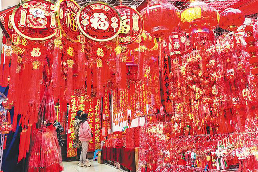 2025年的脚步越来越近,商家们将中国结、灯笼、蛇年玩偶等新年饰品放在显眼位置,引得市民纷纷驻足。