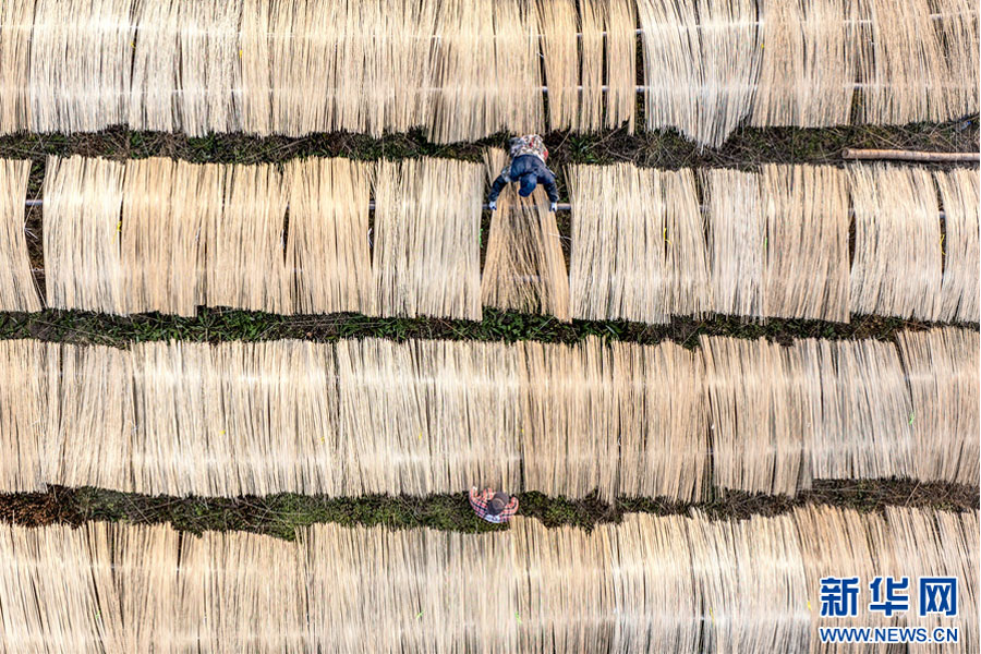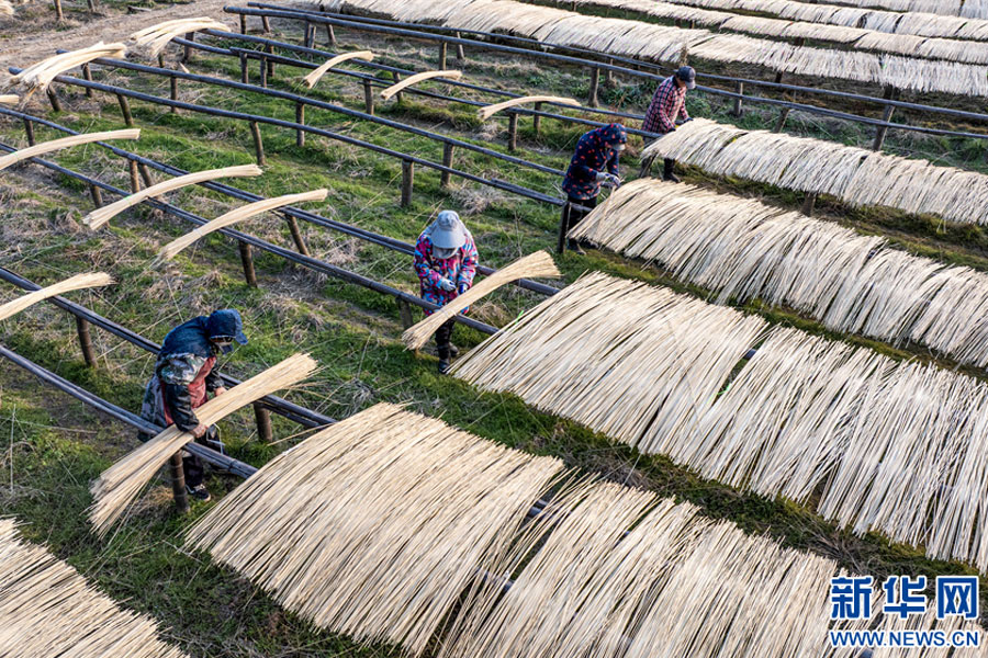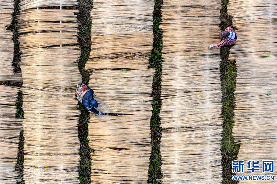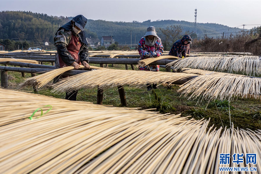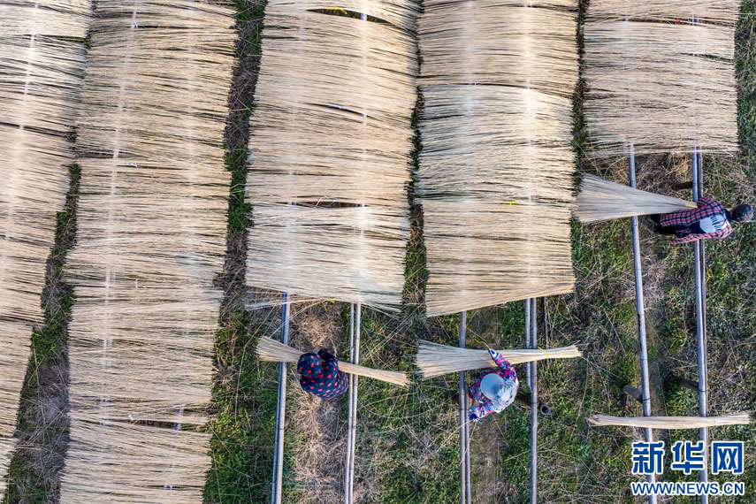 近日,在安徽省合肥市庐江县龙桥镇安定村,毛竹加工厂工人正在晾晒半成品竹签。
