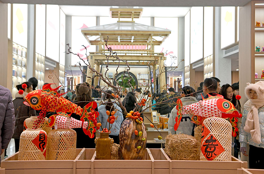 2024年12月29日,安徽省淮南市春申里文旅街区春申书局中,游客通过非遗文创产品展示了解非遗。