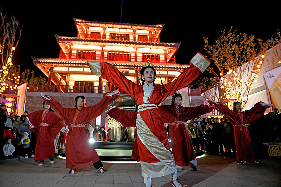 2024年12月29日,演员在安徽省淮南市春申里文旅街区为游客表演具有楚风汉韵的古典舞蹈。