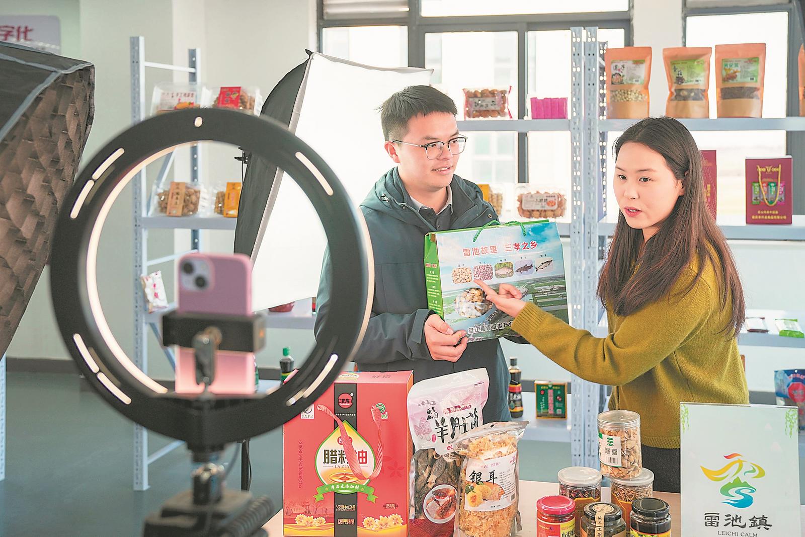 1月10日,望江县雷池镇雷江村主播在网络带货。该镇积极推进“一村一品”,在全镇12村建立12个直播间,以“短视频+直播”模式,推介当地的杂粮、有机果蔬、农家小吃等特产。 记者 李博 摄