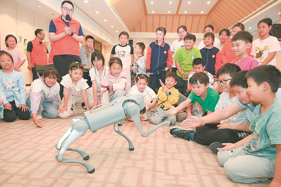 近日,在马鞍山市和县科技馆,来自功桥镇的30名学生正在与“机器狗”进行现场互动,感受科技的魅力。通讯员 秦祖泉 摄