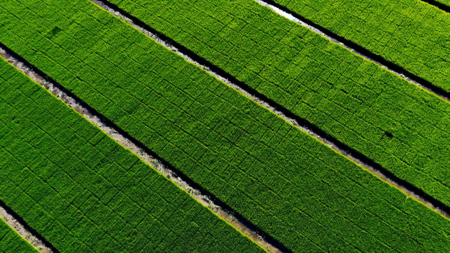 盛夏,在安徽省颍上县王岗镇,农人们熟练地拔秧、运秧、插秧。微风拂过,青绿的秧苗轻轻摇曳,泛起层层绿波,勾勒出一幅宁静而美好的田园风光。(徐红梅 房子仪)