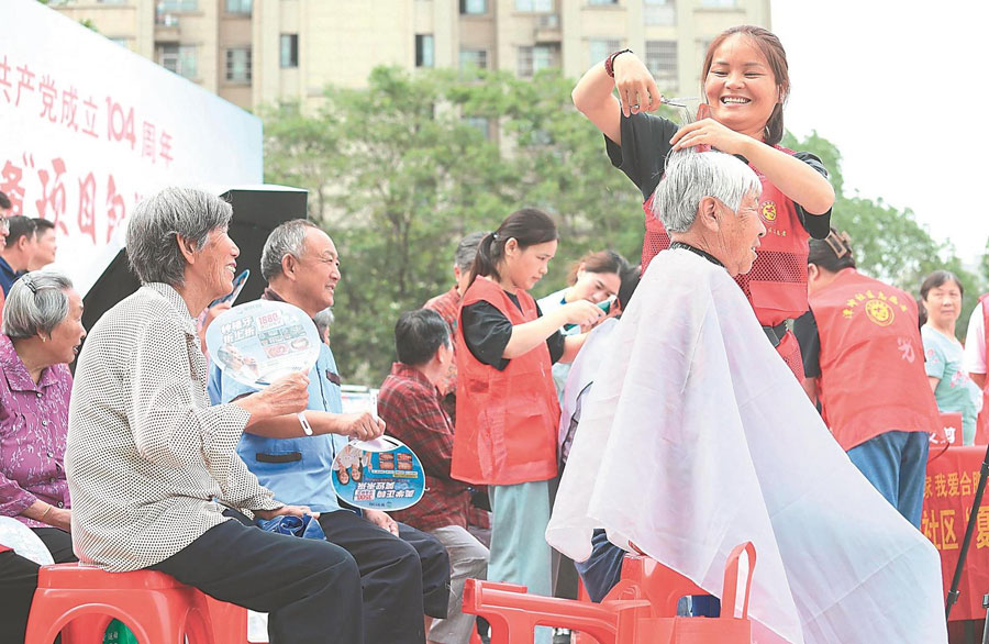 6月24日,在肥西县上派镇四十埠社区法治广场,党员志愿者为社区居民理发。近年来,肥西县创新推出“在职党员服务项目包”活动,为辖区居民提供志愿服务。本报通讯员 陈家乐 摄