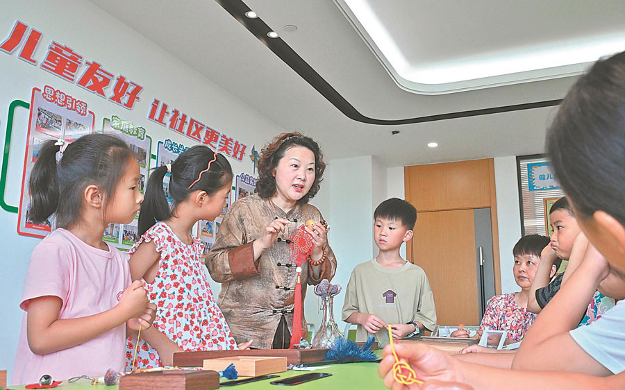 7月2日,合肥市包河区义城街道迎淮社区,小朋友在老师的带领下学习庐州绳记非遗技艺。本报记者 程兆 摄