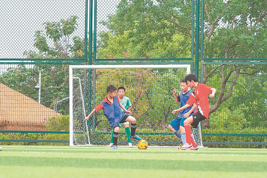 6月27日,芜湖市繁昌区峨山镇,小学生在足球场上角逐。暑假期间,繁昌区教育部门依托足球协会等举办少儿足球夏令营,丰富学生暑假生活。本报通讯员 肖本祥 摄