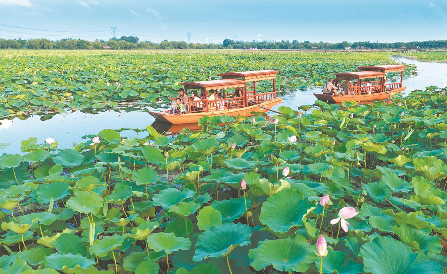 7月20日,淮南市毛集实验区焦岗湖国家湿地公园的荷花淀,游人乘船观赏荷花。当日是入伏第一天,许多市民和游客来此亲水、消暑、赏荷花。据了解,焦岗湖是淮河流域天然浅水湖泊,湿地面积6万亩,生物资源丰富,数百种野生动植物繁衍于此,被誉为“淮河大湿地,华东白洋淀”。入夏以来,万亩荷花竞相开放,形成了独特的生态奇观。记者 李博 摄/视觉安徽
