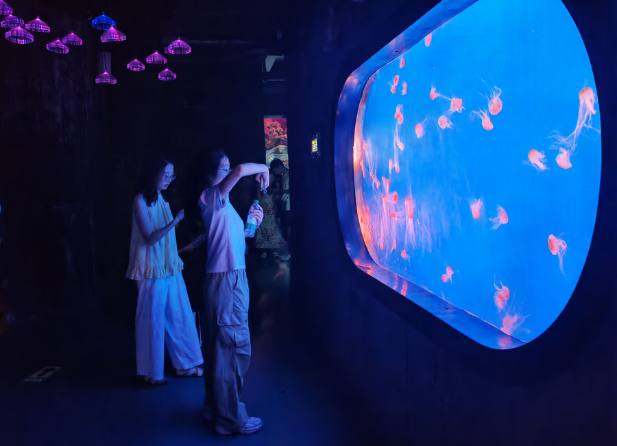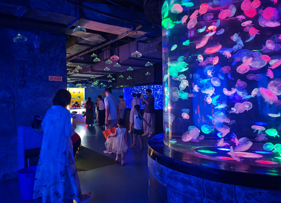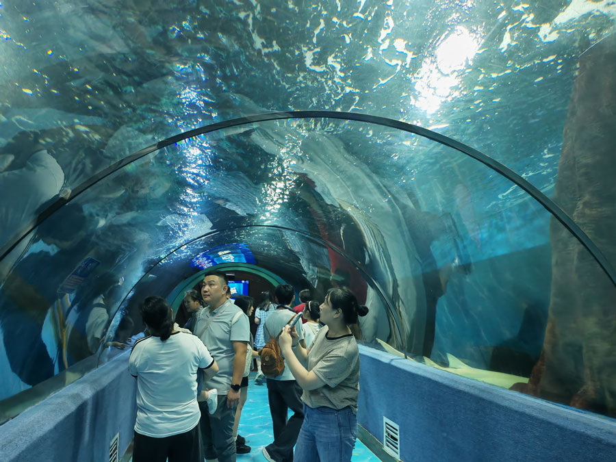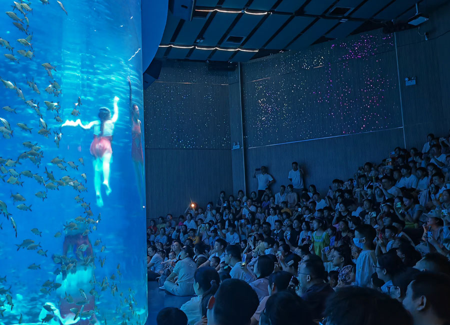 8月3日,中伏时节,暑气逼人。合肥海洋馆里清爽宜人、游人如织、热闹非凡。大人和孩子们观赏着丰富多样的海洋生物,体验着海洋世界带来的美好,流连忘返。美人鱼表演、海狮表演、海豚表演等吸引了众多观众,现场不时传出掌声和欢笑声。(贺鹏云 摄)