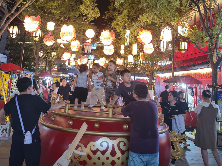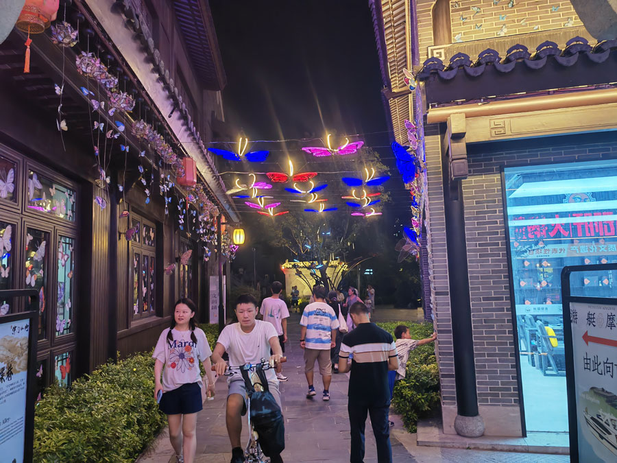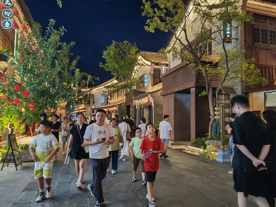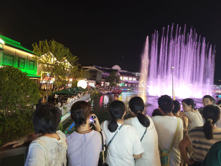 8月23日傍晚,华灯初上,霓虹闪烁,古色古香的塘溪津门水街游人如织。以宋式文化为底蕴的津门水街,不仅汇集各色美食,还有各类国风文创小铺。夜幕降临,美轮美奂的水光交融表演更是吸引大量游客来此打卡消费。“夜经济”不仅点亮了城市的夜色,也在不断激发消费新活力。(贺鹏云)