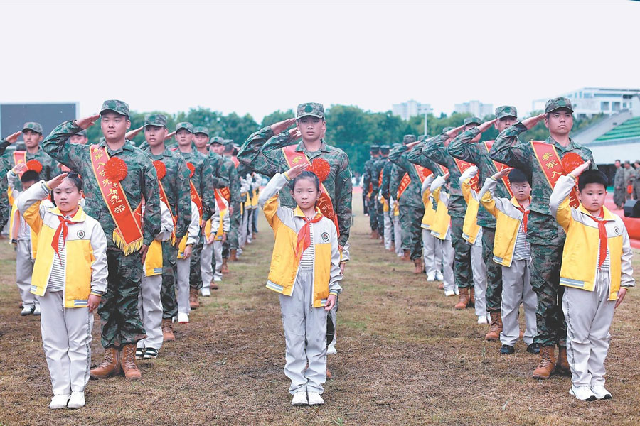9月15日,在芜湖市繁昌区孙村镇中分村新四军第三支队司令部旧址,当地群众欢送入伍新兵。数十名新战士带着家乡人民的嘱托和期盼,奔赴军营,投身国防建设。通讯员 肖本祥 摄