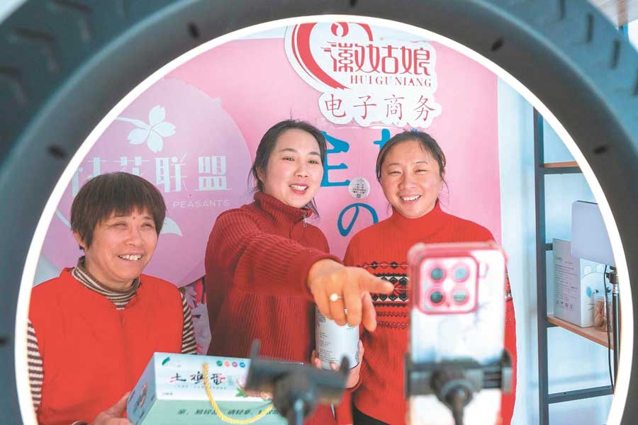 12月14日,在旌德县庙首镇东山村徽姑娘电子商务直播间,“村花联盟”成员正为村民提供免费代购代销,将皖南土鸡、高山茶叶等农特产销往全国。通讯员 肖本祥 摄