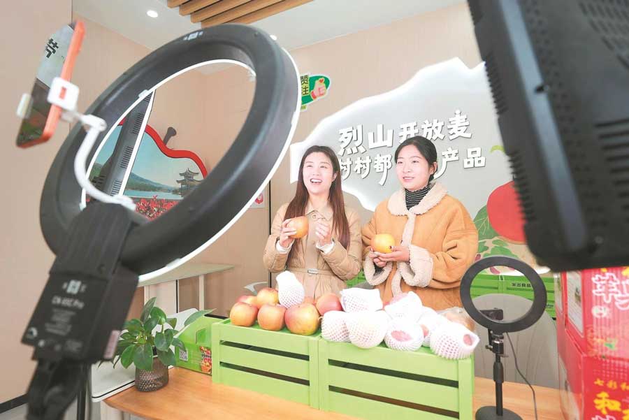 近日, 在淮北市烈山区宋疃镇智慧物流园农产品展销中心的“烈山农场”线上农特产品超市,工作人员在帮助农户直播销售特色农产品。通讯员 冯树风 摄