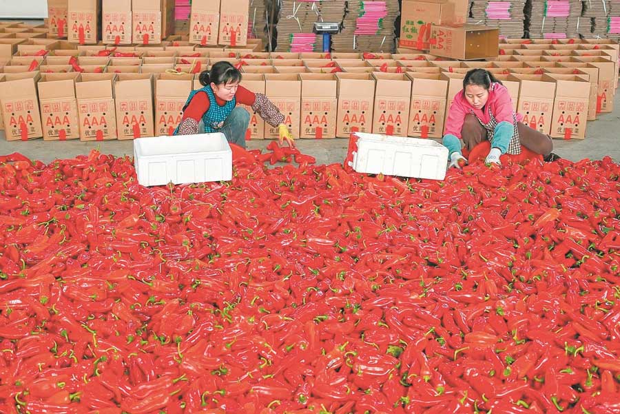 1月16日,在和县历阳镇沈家山村一处蔬菜收购点,菜农们将新鲜的红辣椒分选、装箱。近年来,和县大力发展特色蔬菜产业,有效带动农户增收。通讯员 秦祖泉 摄