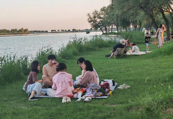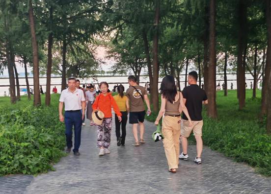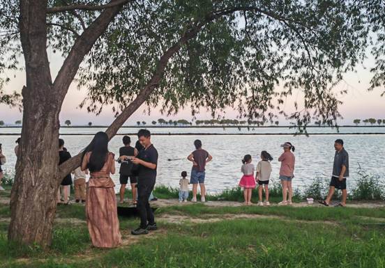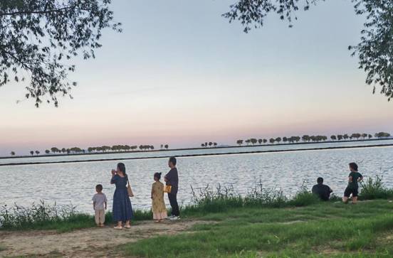 8月17日,恰逢周日,安徽省巢湖湖滨国家湿地公园里游人如织,有的在促膝长谈,有的在拍照留念,有的在观赏美景,大家都乐在其中。
