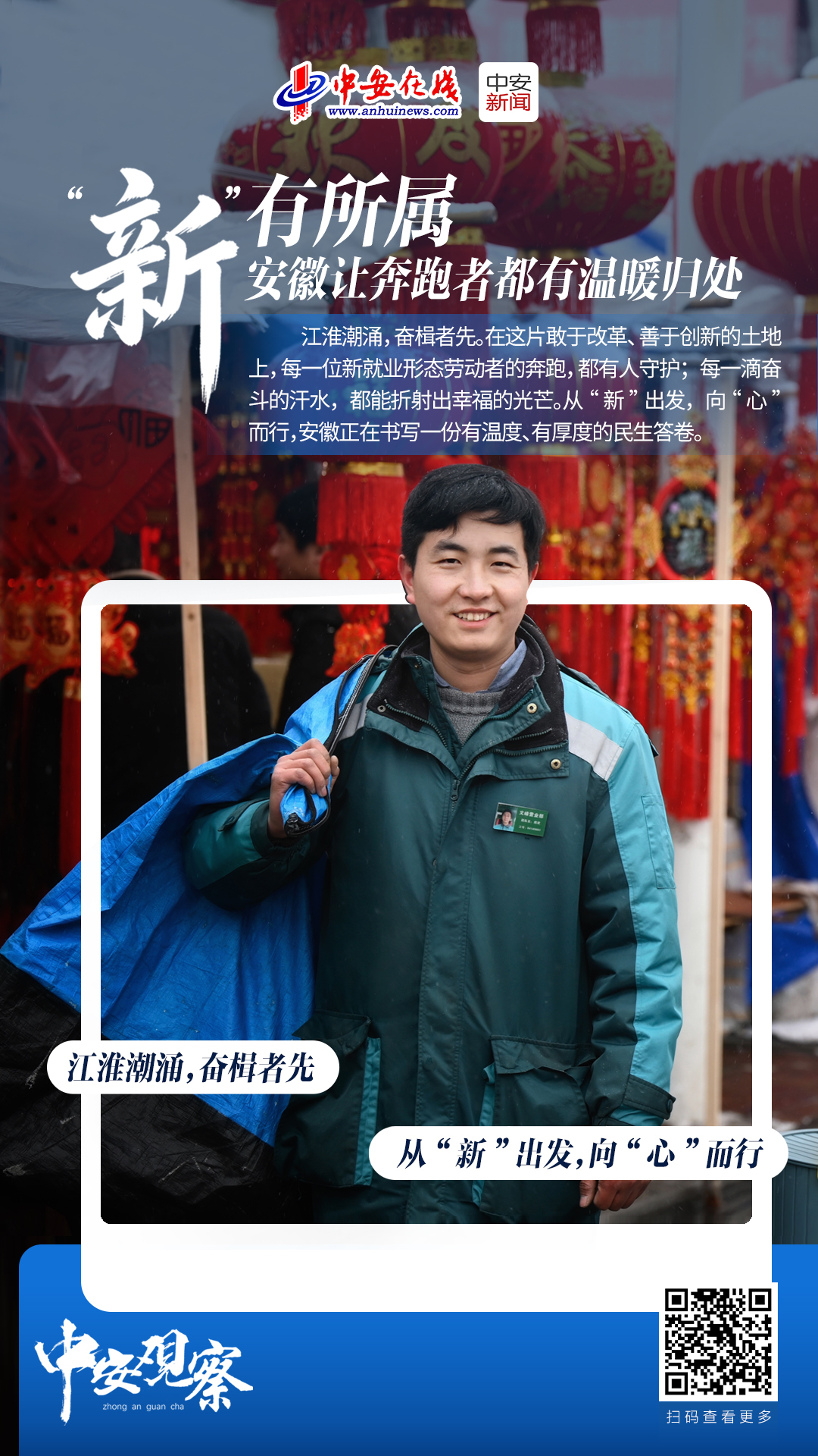 江淮潮涌,奋楫者先。在这片敢于改革、善于创新的土地上,每一位新就业形态劳动者的奔跑,都有人守护;每一滴奋斗的汗水,都能折射出幸福的光芒。从“新”出发,向“心”而行,安徽正在书写一份有温度、有厚度的民生答卷。(记者 张贤良 海报设计 李菁菁)