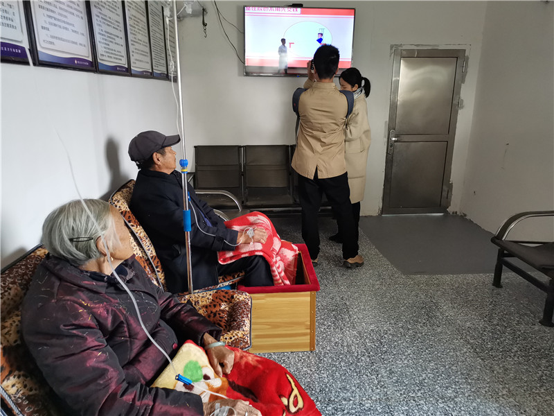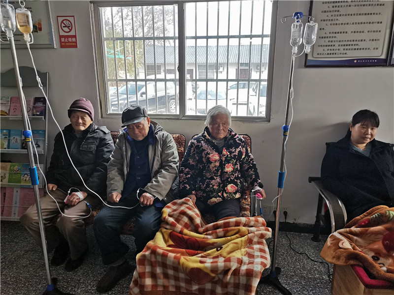 丰乐村卫生室的宣教室内,坐着7名正在输液的村民,墙上的电视内正播放着黄梅歌《家庭医生——我们健康呵护人》。“我们来看病方便,就算来不了,只要一个电话,医生就上门了。”83岁的赵启财说道。记者看到有三位老人还盖着毯子,脚放在热气腾腾的泡脚桶里,赵启财说这是医生怕老人冷专门提供的。村医周幼芳告诉记者,2009年卫生室刚建成我就在这工作了,今年改扩建后,设有诊室观察室、规范药房、治疗室、宣教室和健康扶贫资料档案室,服务能力增强了,群众就医更方便。”