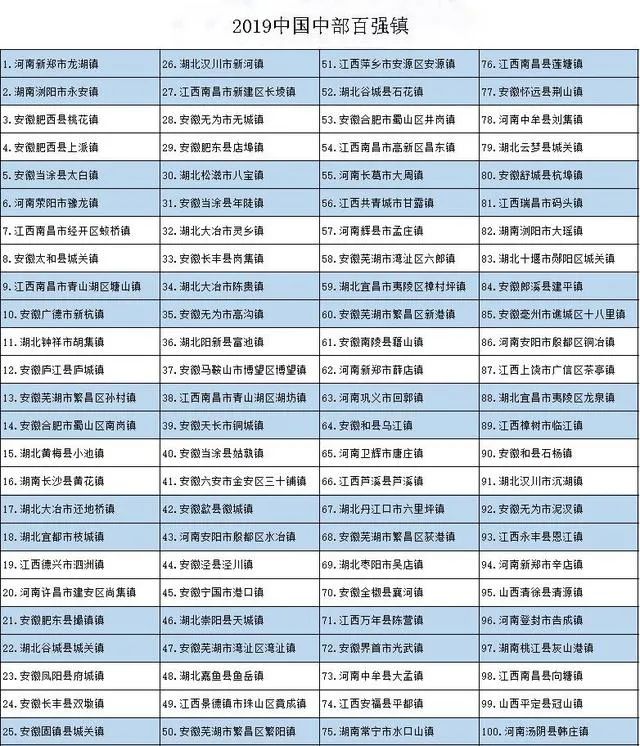 榜单显示,2019中国中部百强镇分别为安徽40个、湖北20个、江西18个、河南15个、湖南5个、山西2个。中部百强镇总人口平均为11.16万人;公共财政收入平均为6.21亿元,较上年增加1.01亿元;工业企业数平均为282个,较上年减少25个;规模以上工业企业数平均为41个,较上年增加1个。