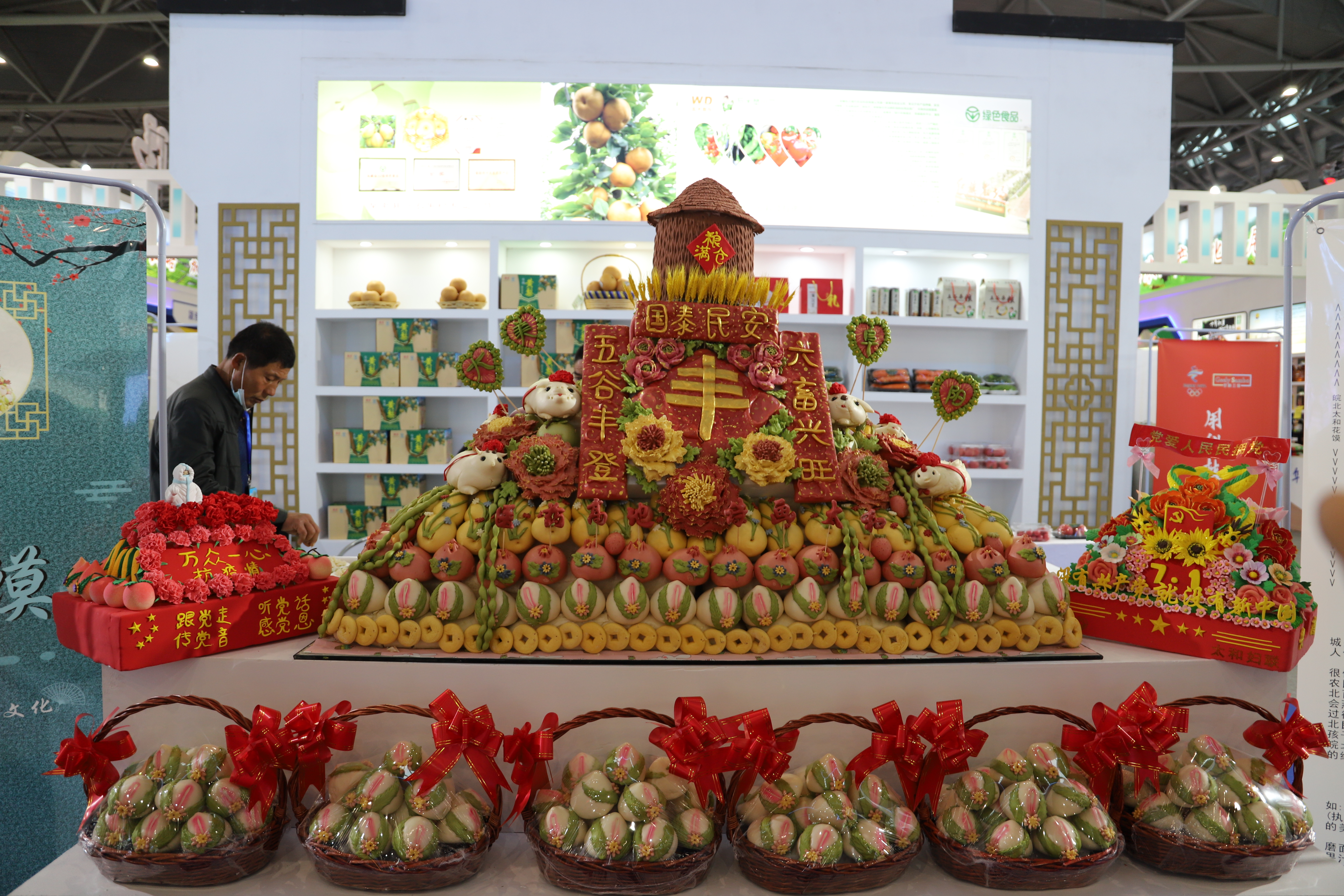 阜阳市展厅的门口,三块巨大的工艺品异常显眼。人物、动物、谷物、蔬菜水果、鲜花等等,五颜六色,栩栩如生。太和县非物质文化遗产太和花馍传承人李雪艳说:“这里有抗疫、粮满仓、建党节三个主题,都是用面粉做成的花馍。”据了解,太和花馍起源于明朝,如今走亲访友、红白喜事、吉房封顶、乔迁开业等等,都要蒸花馍庆贺,饱含着种种美好祝愿。李雪艳在继承传统的同时,也在追求健康,用牛奶、蔬菜、水果汁和面,捏成各种各样的形状后蒸熟,吃起来香甜劲道。此外,李艳红认为,花馍能让小麦价值倍增,花馍最远已销售到新加坡,可以带动农民们增收。