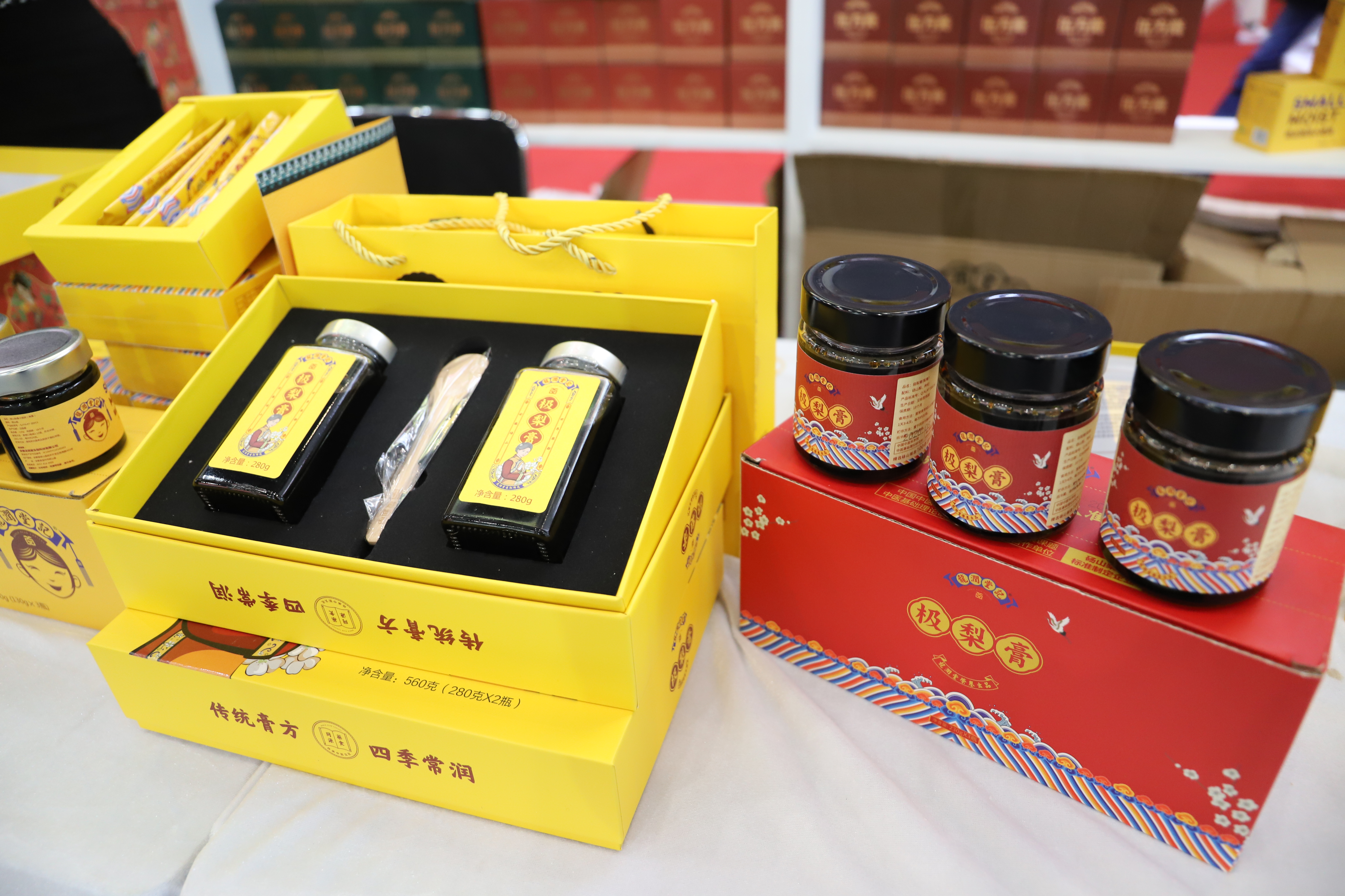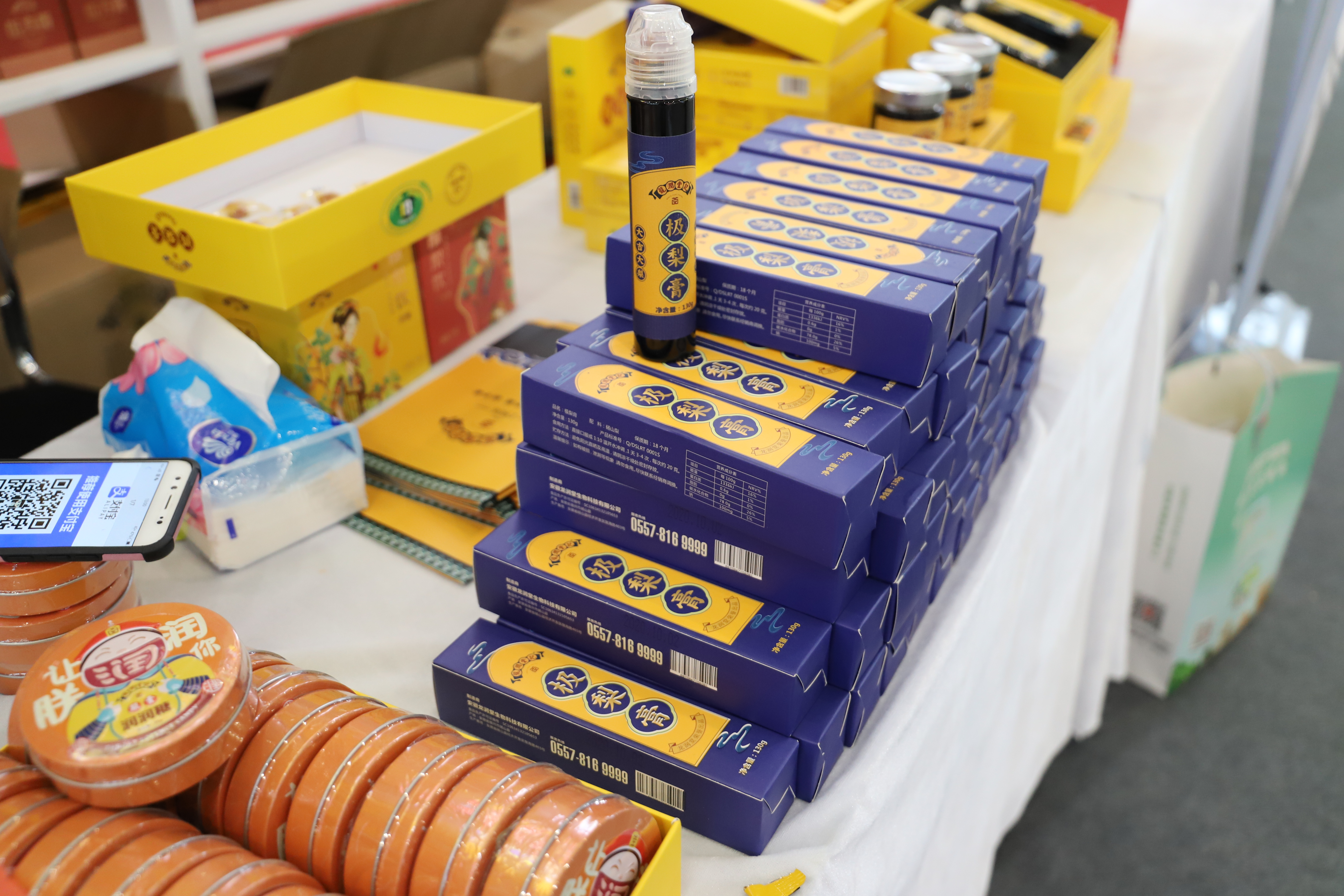 人们在一盘绿莹莹的水果前驻足不前,好奇不已。“这是太秋甜柿,刚研究出的新品种,直接从树上摘下来就能吃,不必经过任何处理,可甜了”。合肥市果祖农业有限公司工作人员面对询问这样介绍道,“每个柿子有七八两重,50元一斤。”据介绍, 这种甜柿拥有陕西泾阳县北塬种植合作社、合肥市正大果树研究所两大基地,目前正以跟踪服务、果园代建、联合建园三种合作模式面向大众。安徽龙润堂生物科技有限公司的展台上看不到梨的身影,只有一些有着显著中国风包装的产品。正如其自称的“始于梨 行于梨 创于梨”,这是一家专注于酥梨深加工生产的企业,已有明星产品极梨膏、酥梨饮、润润糖等,在以往的直播中大受追捧。