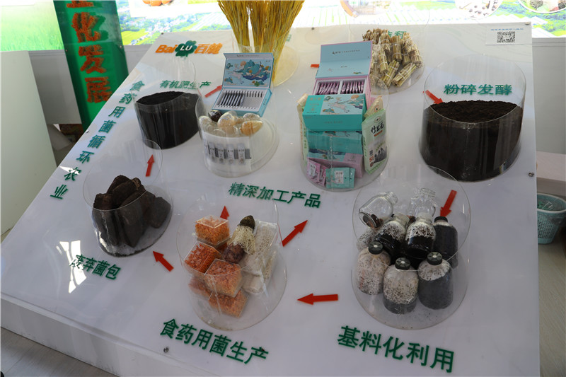 写着“食药用菌循环农业”的简易模型,清楚明了地展示了安徽太和食药用菌产业园的秸秆基料化利用模式。现场负责人赵传峰介绍,秸秆、玉米芯、木屑等农业废弃物经过粉碎发酵,做成培养基料用作食药用菌发酵料,食药用菌产生的废弃基料是优质的有机肥,用于还田。整个循环过程无任何污染,既解决秸秆焚烧问题、畜禽类粪便处理问题,又大大提高了秸秆的利用值和利用率。