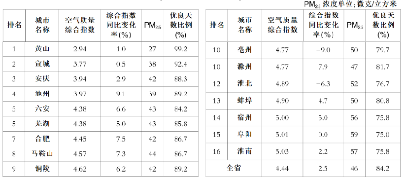 注:(1)城市空气质量排名采用空气质量综合指数大小来确定,指数越小表明空气质量越好,指数相同的城市以并列计。(2)空气质量综合指数是指评价时段内,参与评价的各项污染物的单项质量指数之和(单项指标评价时段内平均浓度与该指标二级标准限值的比值,SO2、NO2、PM10及PM2.5采用年均浓度二级标准限值、O3和CO采用日均浓度二级标准限值),指数越大表明城市空气污染程度越重。(3)空气质量综合指数同比变化率指本年度评价时段内空气质量综合指数与上年同期变化幅度,变化率大于0代表空气质量恶化、小于0代表改善、等于0代表持平。