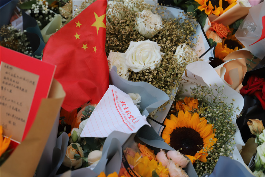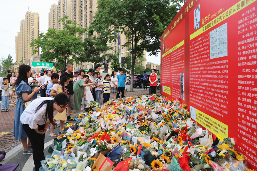 在延乔路路牌下,摆满了向日葵、菊花、玫瑰、百合、康乃馨……花香袭人,国旗、党旗、红领巾、留言等点缀于鲜花丛中,甚至还有北京航空航天大学信纸折成的纸飞机,这些无一不寄托着大家的怀念和崇敬之情。“感谢先辈在黑暗中不断寻求救国之路。”“这盛世如您所愿!向革命先烈致敬!”“你们没能看到的新中国,我们替你们看!”这一句句热诚真挚的留言令人热泪盈眶。在一幅画着陈延年、陈乔年的卡通画上写着:“谢谢你们毕生的奋斗,挺起了中国脊梁!”安徽医科大学的中共预备党员董思睿写了一封长信,向两位烈士承诺:“请您放心,强国有我!”