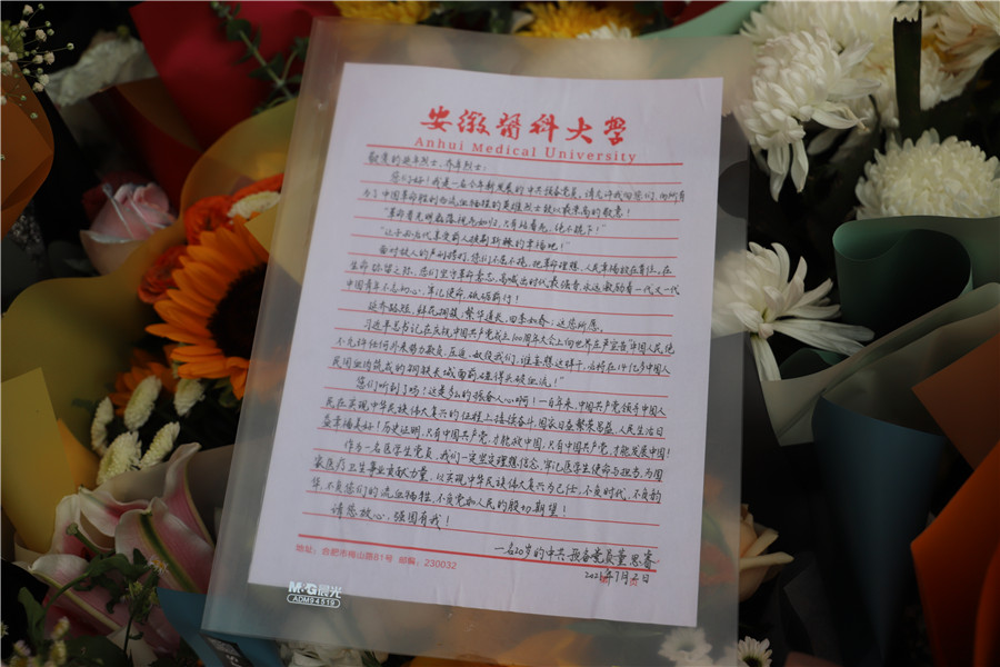 本网讯(记者 史洪芳 陈珺)7月1日,中国共产党百年华诞,许多合肥市民自发前往市中心的延乔路献花、留言,表达对陈延年、陈乔年烈士的敬仰之情,以今日的幸福生活告慰革命先烈。