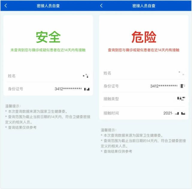 3.若未查询到您与确诊或疑似患者在近14天内有接触,显示“安全”;若查询到相关信息,则显示“危险”。